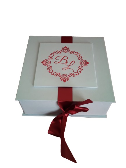 Caixa cartonada, confeccionada com papelão Paraná 1125g e revestimento personalizado em off-set adesivo, com fita em cetim.