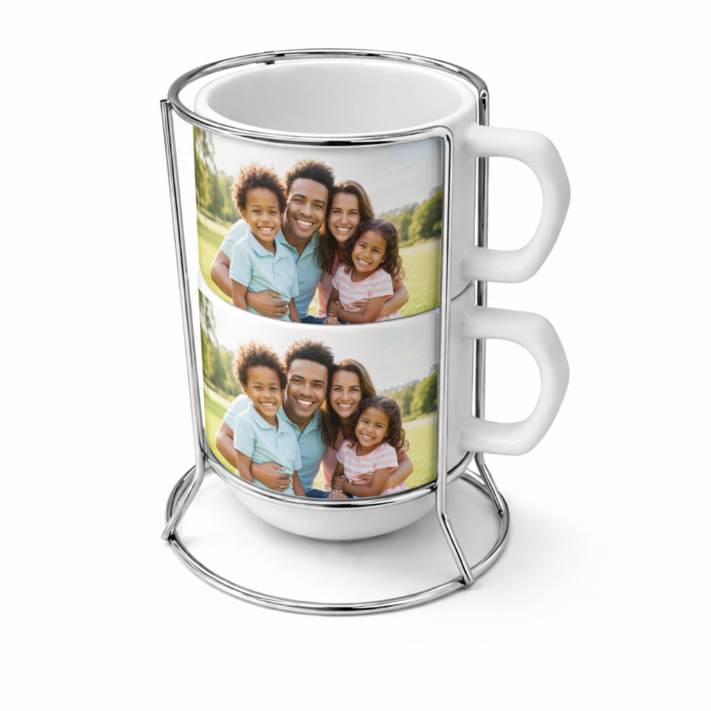Kit 2 Xícaras Branca Fosca de Cerâmica personalizada em Sublimação de 150ml e Suporte de Metal.