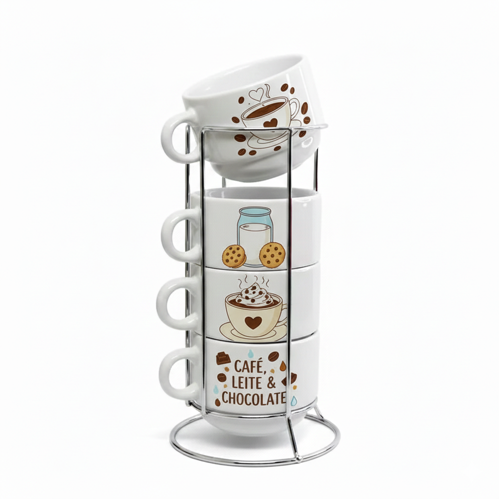 Kit 4 Xicaras de 200ml e Suporte de Metal.